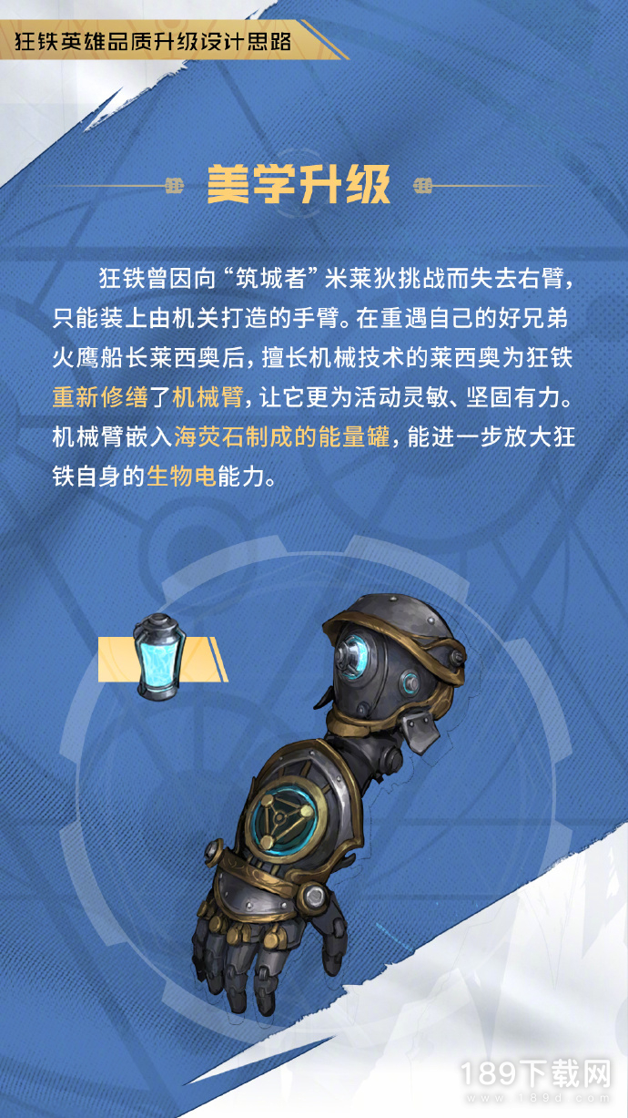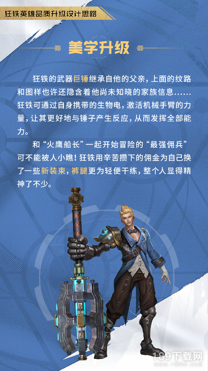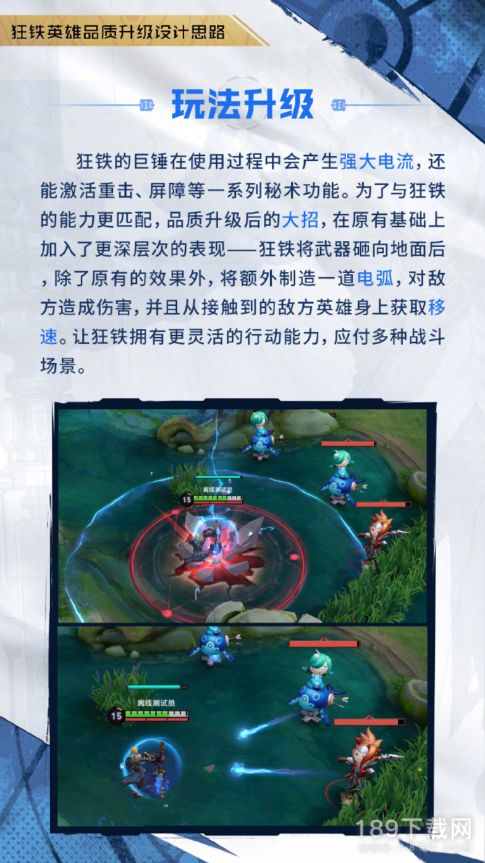 狂铁的巨锤在使用过程中会产生强大电流,还能激活重击、屏障等一系列秘术功能。为了与狂铁的能力更匹配,品质升级后的大招,在原有基础上加入了更深层次的表现--狂铁将武器砸向地面后,除了原有的效果外,将额外制造一道电弧,对敌方造成害,并且从接触到的敌方英雄身上获取移速。让狂铁拥有更灵活的行动能力,应付多种战斗场景。