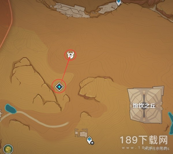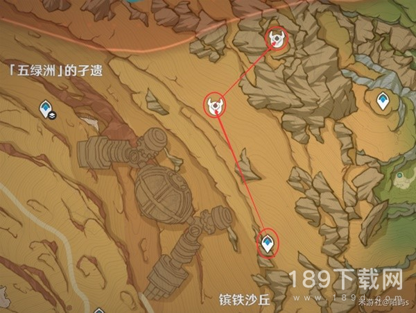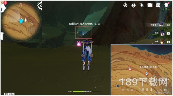 来到【五绿洲】的子遗下方的传送点,朝着小地图的西方向(左边)偏北(上边)看,直接飞到前方的愚人众营地。