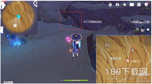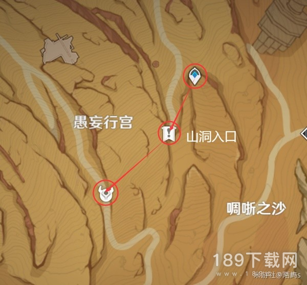 来到愚妄行宫右上角的传送点,朝着小地图的南方向(下边)看,在前方不远处就是山洞的入口。