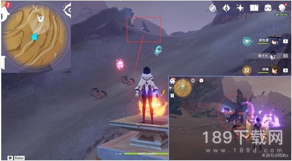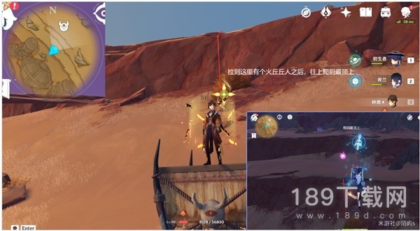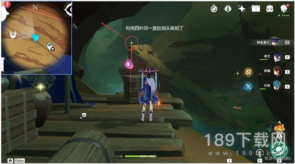 拉四叶印到了有个火丘丘人的位置后,朝着小地图的东方向(右边)偏北(上边)看,从前面的墙壁一直爬到最顶层。