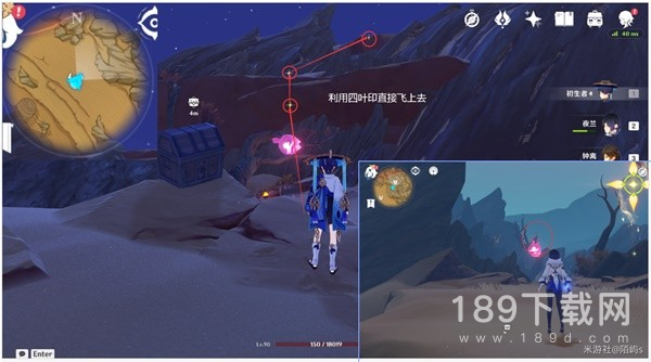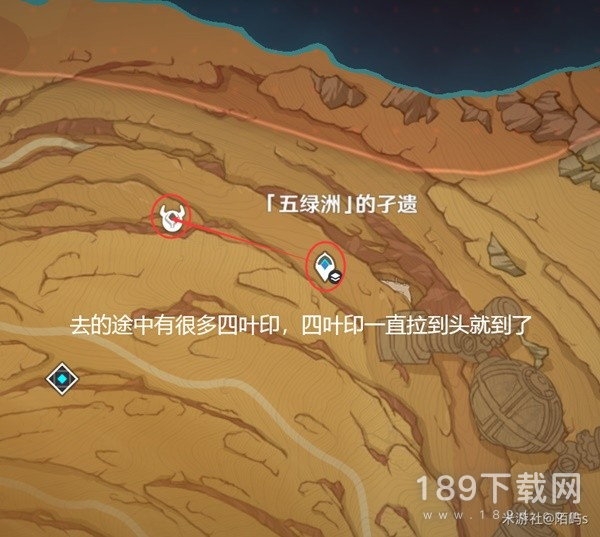 来到愚人众营地之后,继续朝着西方向(左边)看,在前面有个四叶印,直接拉过去。