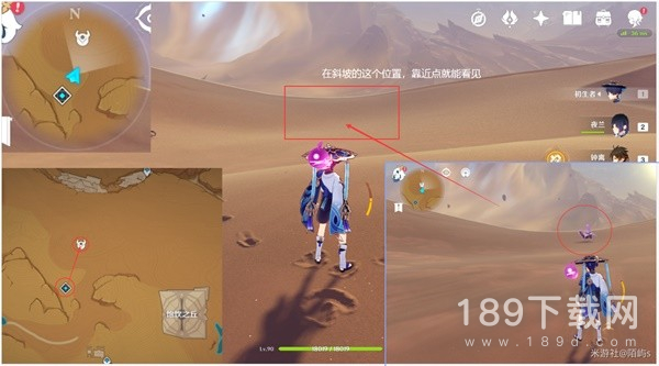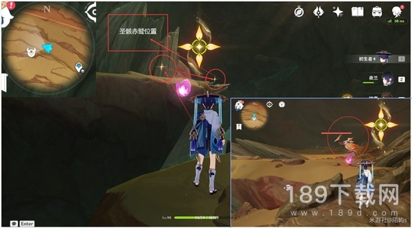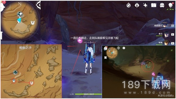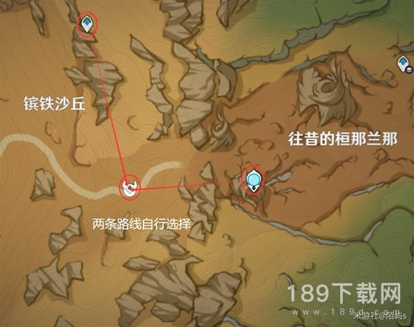 来到镔铁沙丘上方的传送点,朝着小地图北方向(上方)看,在下面的平台有四叶印,拉过去然后一直往前拉。