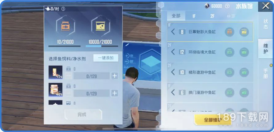 当玩家把鱼放到鱼缸饲养后,会获得以供水族馆升级的经验值;玩家可以选择到控制台一键维护/单缸维护,也可到鱼缸旁进行单缸维护,维护后会更有利于获取经验值。