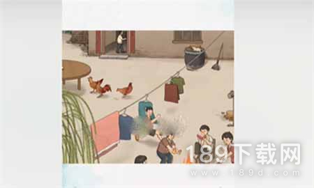 3、此外,桌子上的鸡头和筷子,还有敲碗和摘喇叭花,屋里面有人在打伞,墙上有个壁虎。