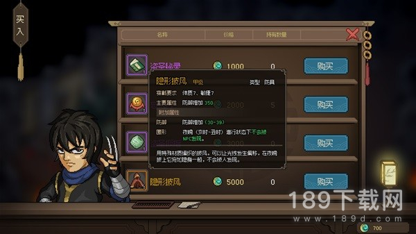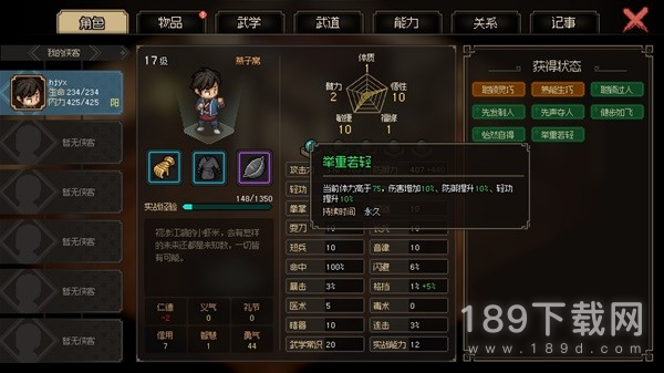 但是不要在意这些细节,这种“人物卡”本身就是这一类游戏重复可玩性的基础,不仅玩家车出来的主角会有,游戏中所有的NPC同样会有,你看他的相关属性、武学等信息,就可以决定了是不是要和他比划比划,还是需要搞好关系义结金兰。