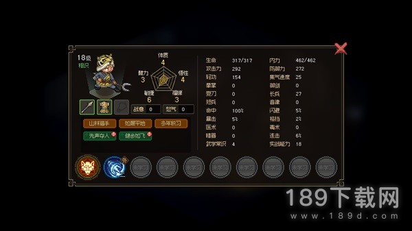 《大侠立志传》在“车卡”环节同样没有让我失望:玩家需要对臂力、体质、敏捷、悟性和福缘进行加点,虽然属性的分类算是RPG老玩家一眼可见的熟悉,但游戏的机制设计并没有停留在这一步——每个属性达到10就有被动加成,比如10敏捷就会每场战斗100集气开始(决定出手速度),然后达到更高的属性值还会有额外的加成。