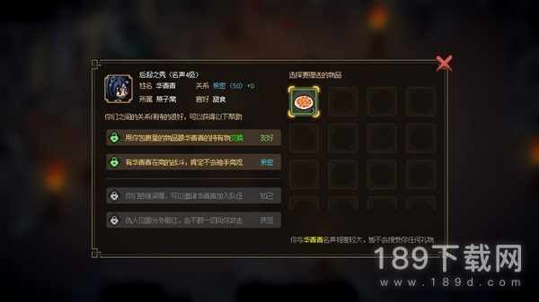 这一点还是上文提到过的“人物卡”的进一步内容扩展,玩家可以与NPC强化关系等级,从友好、亲密到知己,或者是,仇人见面分外眼红的厌恶。友好可以“以物易物”、亲密可以协助战斗、知己则可以邀请加入队伍。