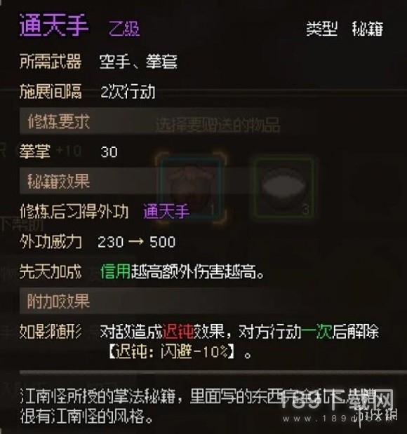 10)在这之后,可以继续提升好感度了,我们选择把江南怪的好感拉满。获得秘籍【通天手】,并得知出城密道的所在。通天手还是非常猛的,信用越高通天手的伤害也越强,还自带迟钝效果。更别说它还是一个群攻技能,能一次攻击三个敌人。