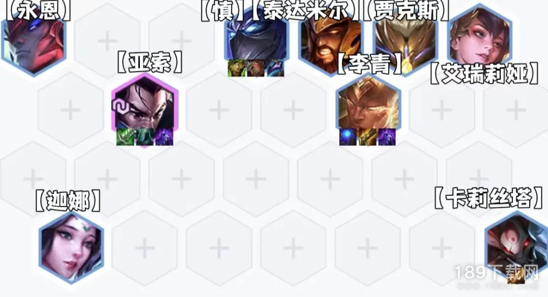 阵容:亚索,迦娜,贾克斯,艾瑞莉娅,卡莉丝塔,泰达米尔,慎,永恩,李青