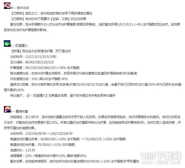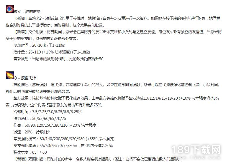 挚友效果:悠米获得额外10-20%治疗&护盾强度(根据友军等级),她的挚友获得3/5/7/9/11 (+4% 法术强度)附加治疗。该效果受悠米的治疗&护盾强度所影响。