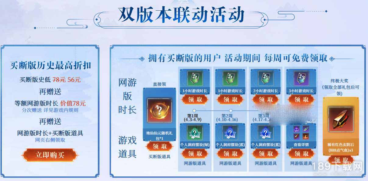 3、在PC端网络版不删档测试之前购买过买断版的玩家,可以在公测版上线后领取价值78元的等额网游版时长返还,按照玩家游戏内的境界赠送;
