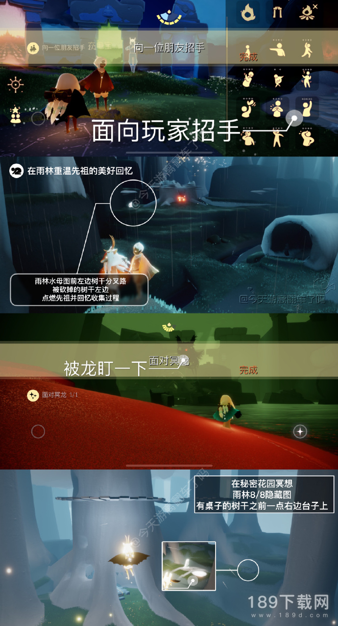 「在秘密花园冥想」在雨林8/8隐藏图内,内有桌子的树干右边石头上的石碑前光圈处打坐并留言