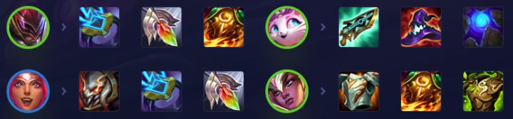 1.蓝霸符 2.离子火花(尼菈) 3.救赎(尼菈) 4.海克斯科技枪刃 5.泰坦的坚决 6.灭世者的死亡之帽 7.日炎斗篷(李青) 8.离子火花(李青) 9.救赎(李青) 10.日炎斗篷(芮尔) 11.石像鬼石板甲 12.狂徒铠甲