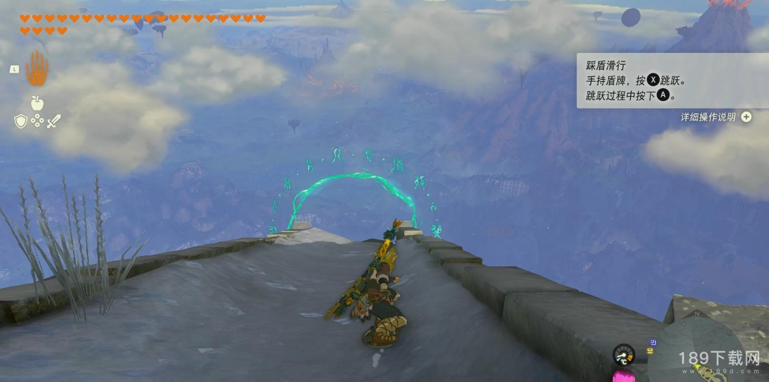 利用踩盾滑行滑下前方的坡道穿过绿色圆圈。