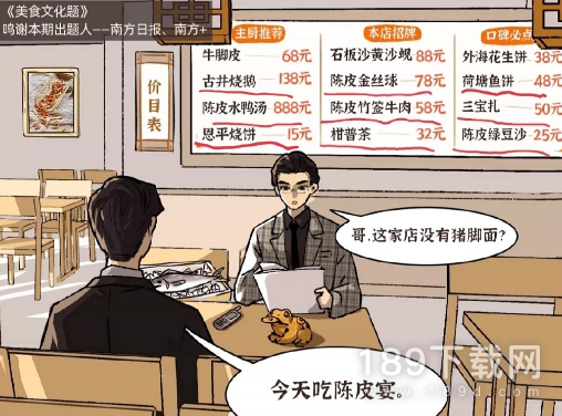 今天是道美食文化题,从题图得知“陈皮宴”,筛选出和陈皮有关的菜