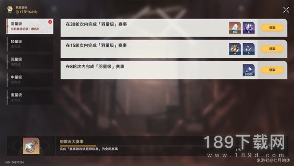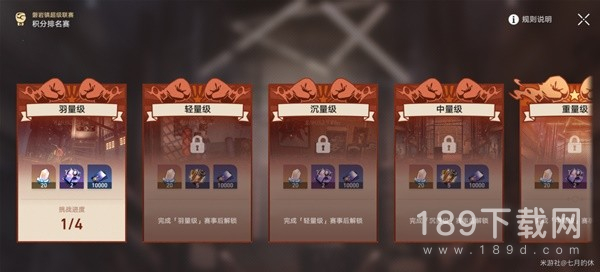 一共5个挑战:羽量级、轻量级、沉量级、中量级、重量级,每天解锁一个。每个挑战排名越高,奖励越多。