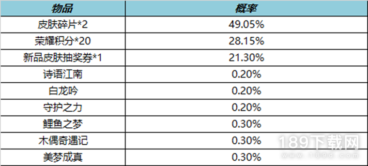 购买红蓝对决(1日),可额外随机获得以下之一:诗语江南、白龙吟、守护之力、鲤鱼之梦、木偶奇遇记、美梦成真、荣耀积分*20、新品皮肤抽奖券*1、皮肤碎片*2。