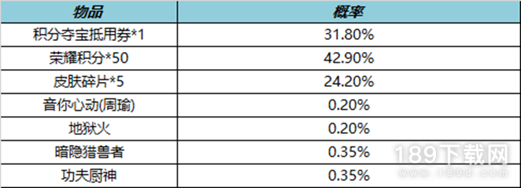 购买酷炫机甲(1日),可额外随机获得以下之一:音你心动(周瑜)、地狱火、暗隐猎兽者、功夫厨神、荣耀积分*50、积分夺宝抵用券*1、皮肤碎片*5。