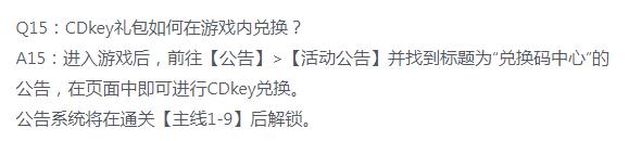 根据《白夜极光》官方的说明,进入游戏后,前往【公告】>【活动公告】并找到标题为“兑换码中心”的公告,在页面中即可进行CDkey兑换。
