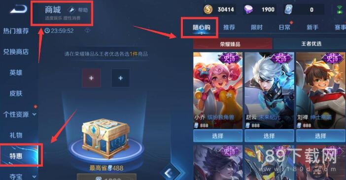进入王者荣耀商城界面后,点击左侧的“特惠”,即可看见界面右边的“随心购”,玩家可在荣耀臻品和王者优选中分别选择一款商品,以优惠价格打包购买,该活动仅可参与一次。
