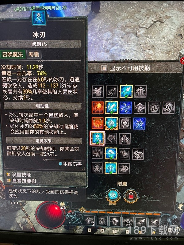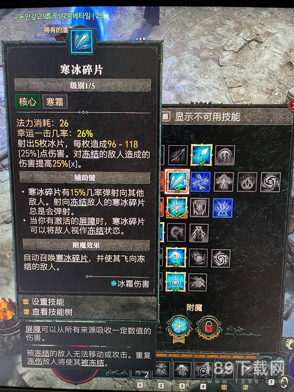 本技能最关键打冰冻+25%伤害。本套搭配易伤100%存在,能增加30-50%不等的伤害,配合装备词条有屏障+30%伤,已经能达到100%的赠伤,所以伤害非常高的,而且打冰冻怪100%弹射(既变成aoe群体技能),而有屏障的时候,视所有敌人为冰冻。