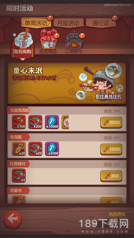 4、红将碎片:350个泡泡水只能换购5个红将碎片,跟黑市400金砖买2个随机碎片相比,相当于1个泡泡水=2.9个金砖,这个小编还是不推荐兑换,没必要。