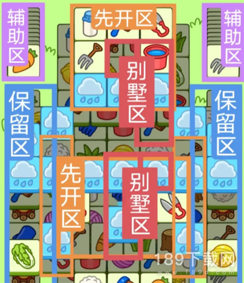 3.必要时可以用紫色盲盒区辅助消除,盲盒区后期不用留太多,留几张备用即可。