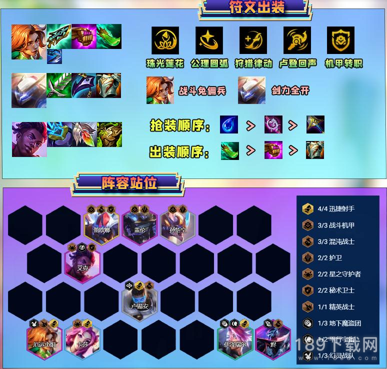 该阵容成型难度不高,重要的是快速升七搜到队伍中的两个核心厄运小姐和盖伦,该阵容中期非常强势,属于吃分阵容,后期上限并不高。