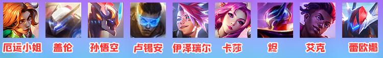 阵容:厄运小姐、盖伦、孙悟空、卢锡安、伊泽瑞尔、卡莎、烬、艾克、蕾欧娜