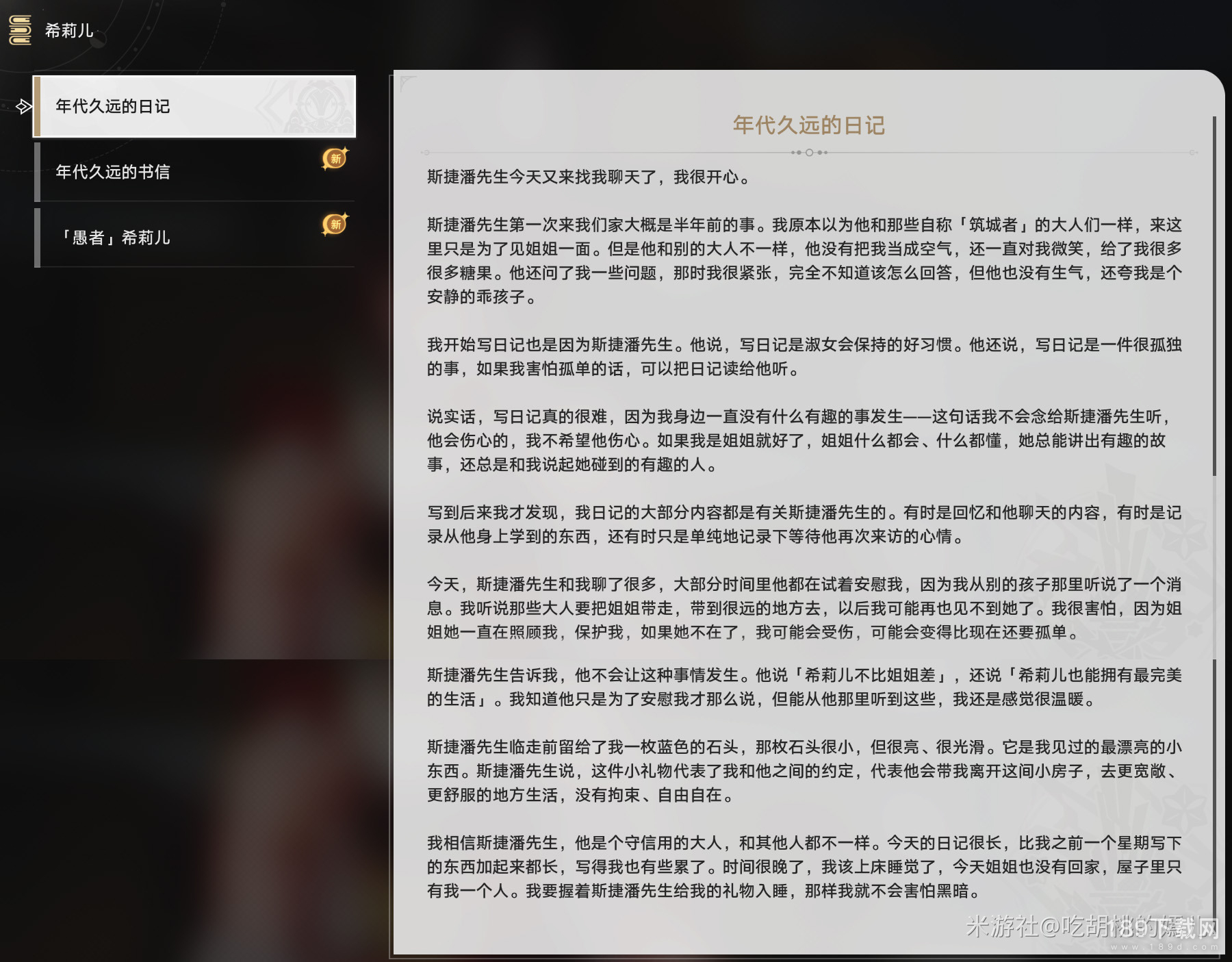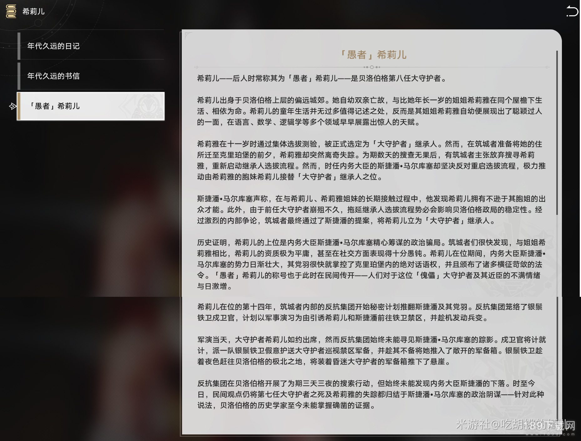 之后,我们再回到【历史区】,点击那幅画交互。我们会惊喜的发现,希莉儿的文案最后,补充了这么几句话(也算是给到希莉儿这条线一个比较圆满的结局了):
