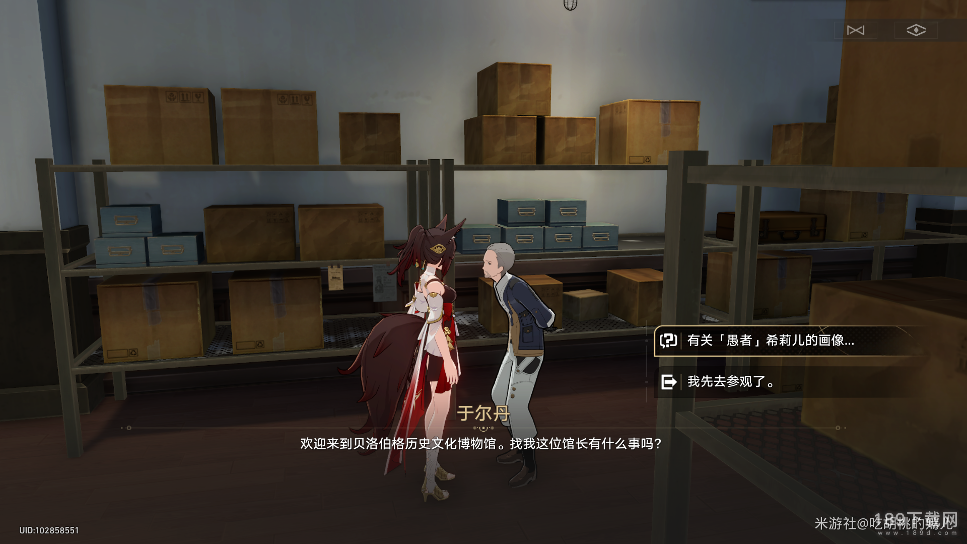 随后,来到【博物馆前台】右手边那间房,找到馆长【于尔丹】,对话(有关愚者希莉儿的画像)。