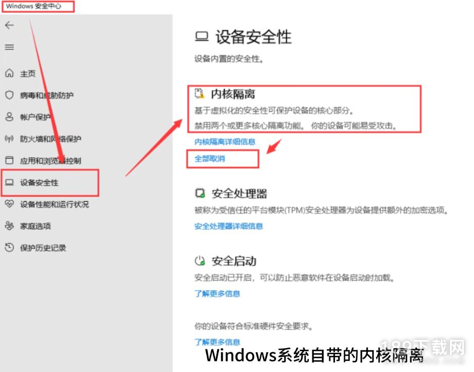 在安全中心中找到设备安全性,然后点击内核隔离并关闭,此时再重启游戏即可解决游戏闪退的问题。