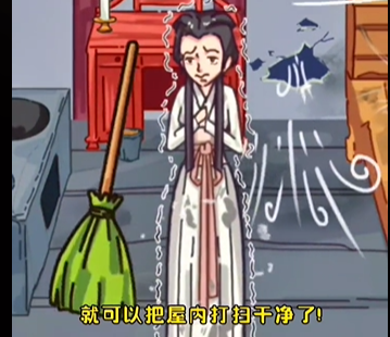 3、做个简易的扫把托给娘娘,把屋子打扫干净。