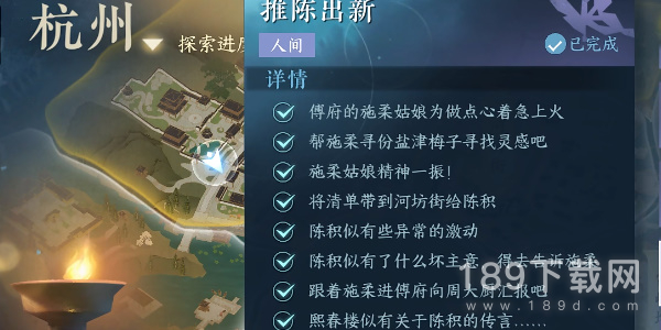 1、我们来到杭州(1413,1143)的位置和施柔进行对话,对话中我们得知他想要吃甜蜜饯,我们需要根据任务指引去购买;