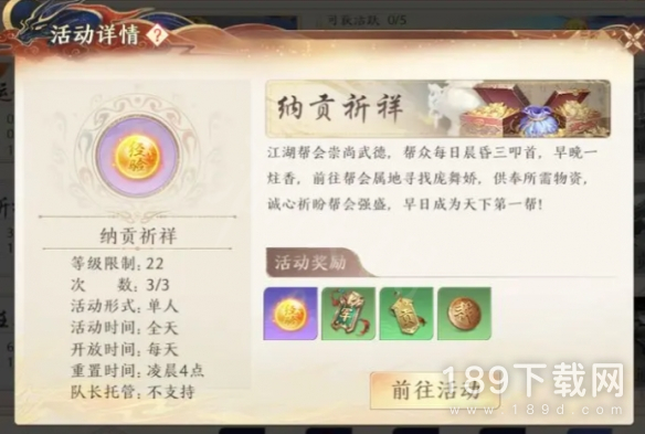 每天可回帮派属地找到庞舞娇参与活动,供奉物资即可获得经验以及奖励。
