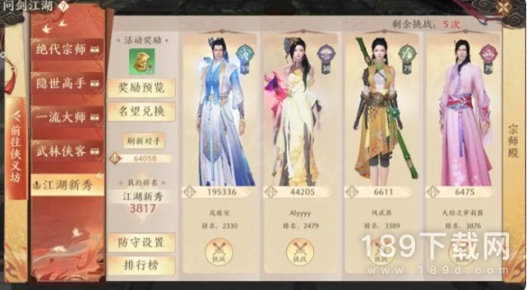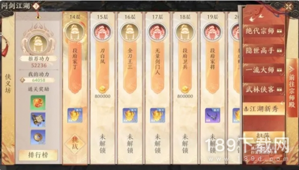 江湖宗师殿通过挑战玩家提升排名可获得绑定元宝奖励以及名望奖励。