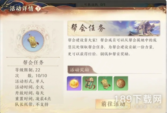 每日必做的任务,一共10次,可获得经验,铜钱,帮贡奖励,点击即可自动寻路完成。