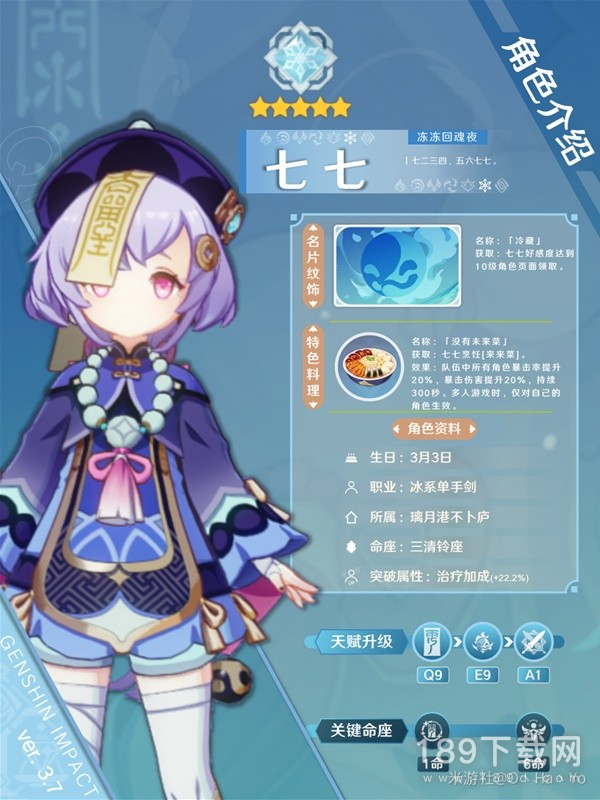 施放Q会以七七为中心(范围差不多班尼特Q领域那么大,和莫娜的Q差不多),对周围敌人造成冰元素伤害施加强冰附着,并给命中的敌人施加[度厄真符]。