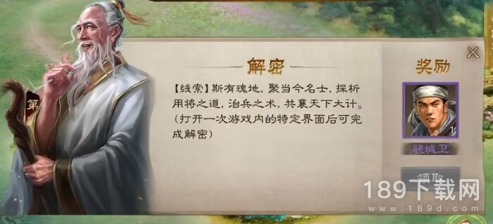 【线索】斯有瑰地,聚当今名士,探析用将之道,治兵之术,共襄天下大计。(打开一次游戏内的特定界面后可完成解密)