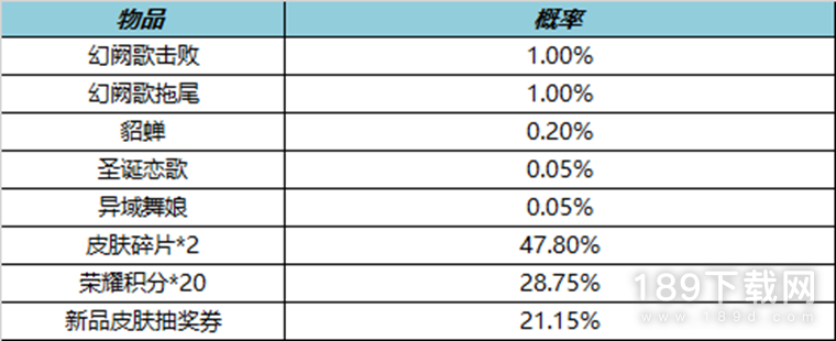 购买红蓝对决(1日),可额外随机获得以下之一:貂蝉专属击败和拖尾特效-幻阙歌、貂蝉、圣诞恋歌、异域舞娘、皮肤碎片*2、荣耀积分*20、新品皮肤抽奖券*1。累计150次必得全部局内特效。