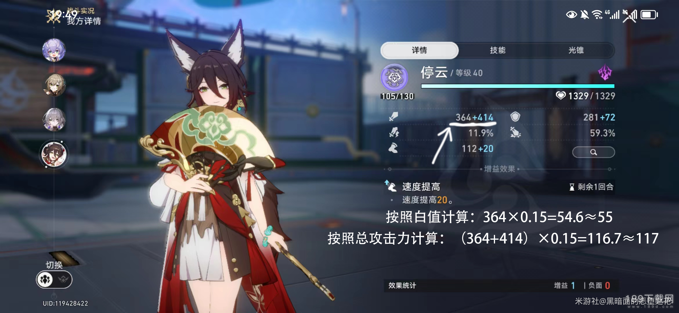 但是会受限于停云的15%的攻击力上限,按白值计算,上限就是55点攻击力;按总攻击力计算,上限就是117点攻击力: