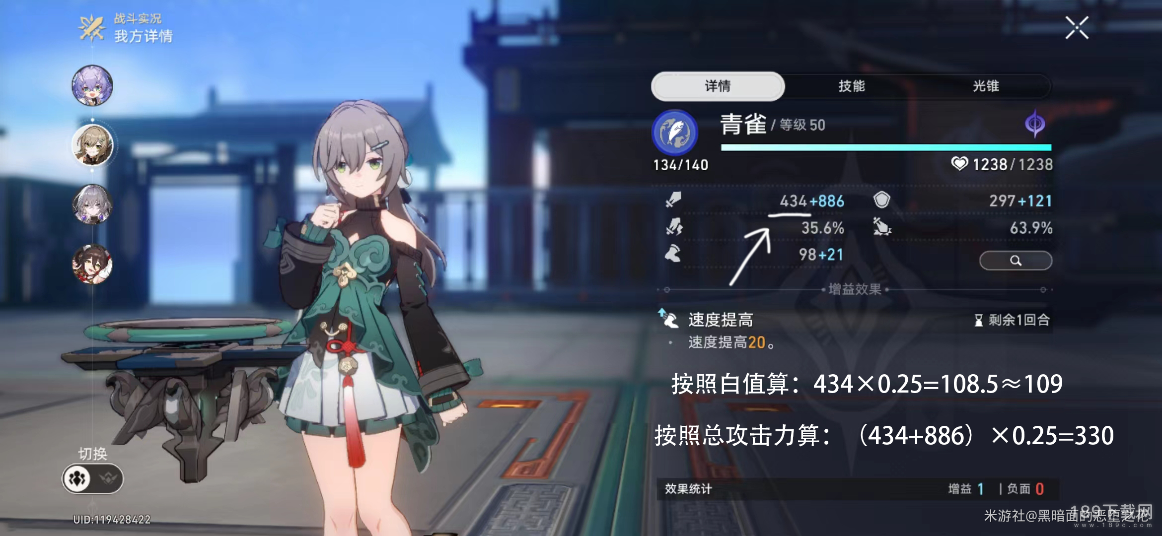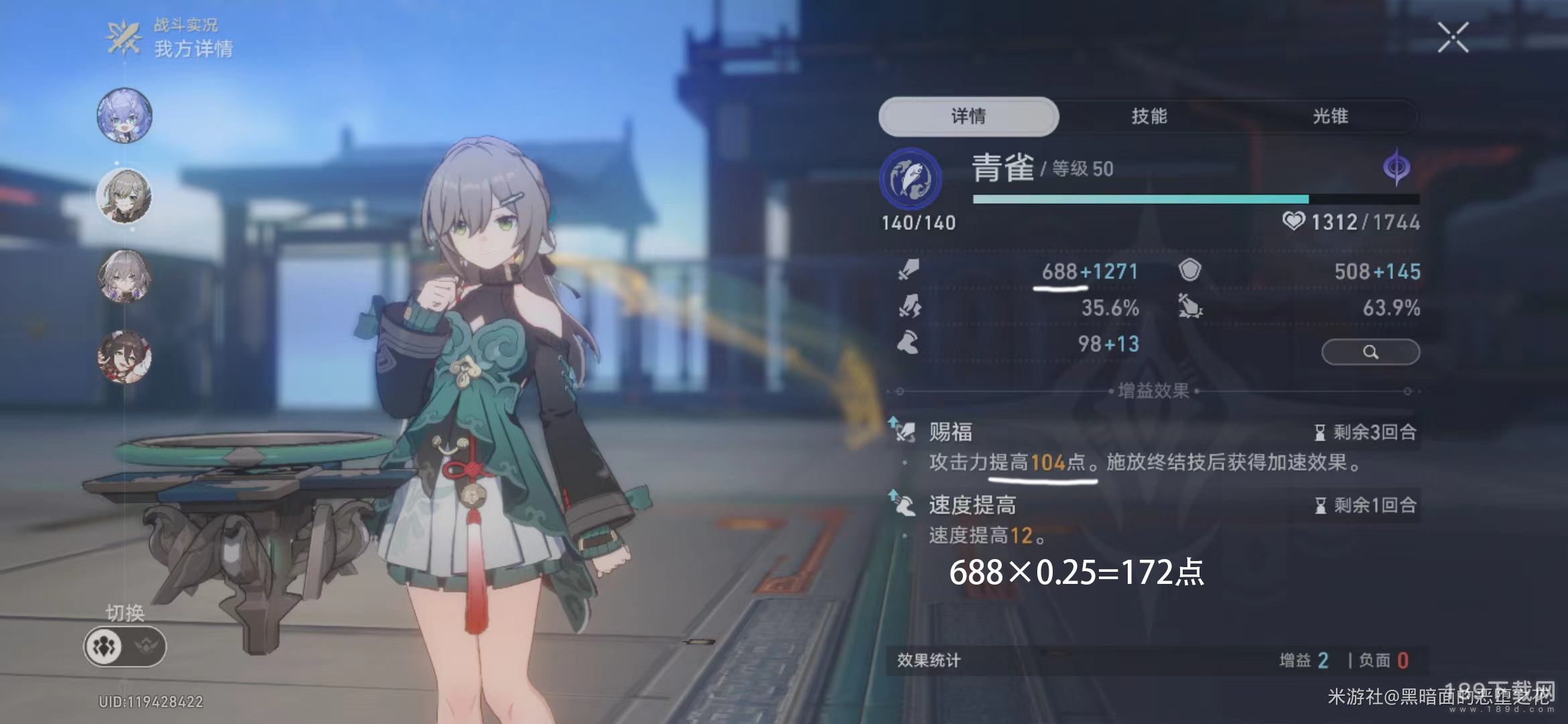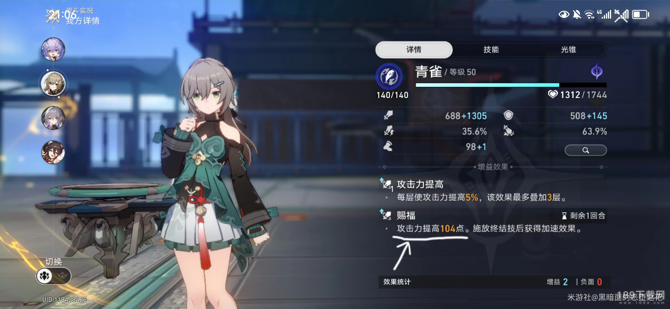 此时青雀的白值攻击力加成是172点,但受限于停云104点的攻击力加成上限,所以【赐福】效果,一共加了104点攻击力。