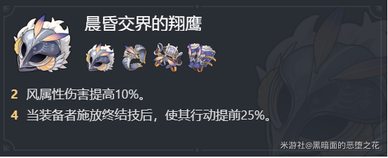 【野穗伴行的快枪手】获取比较简单,不需要特意去刷副本。提高攻击力的同时,还为停云提高了速度,让停云更快行动(虽然并不多),提高增伤的覆盖率。如果脚部主词条是【攻击力】的话,也可以带【晨昏交界的翔鹰】。【激奏雷电的乐队】四件套最主要提高了停云战技增伤的上限,经测试,停云的战技有锁面机制,20%的攻击力所带来的攻击力上限提升,可以在【赐福】效果持续期间全部吃到。