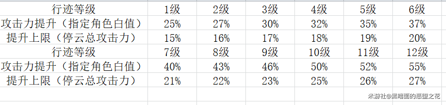 ②当角色的攻击力白值收益<停云总攻击力收益时,最终【赐福】的效果取指定角色攻击力白值的收益。(具体倍率在图下表中)