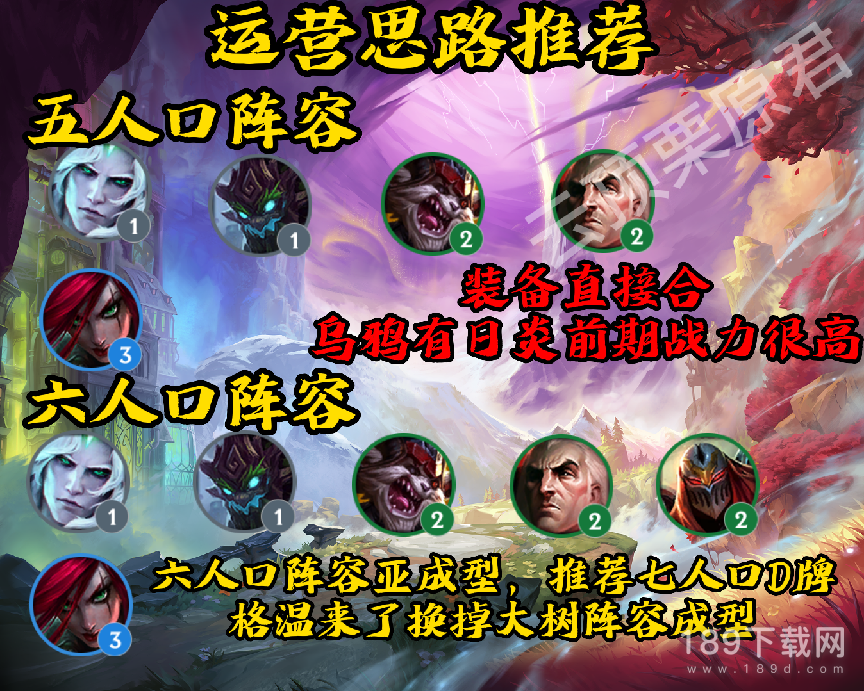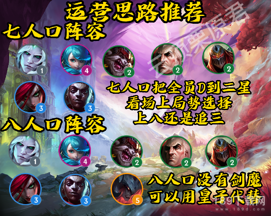 前期不拉人口,用大树和佛耶戈过渡,建议连败开局拿装备或者铲子,中期这个阵容只要全员二星就有很强的战力,只要留体系内的棋子即可,打完狼哥上7开始D牌,卡特,劫,克烈任意一个三星直接上八找出剑魔,没有的话可以用皇子代替,都没有用天使也可以。