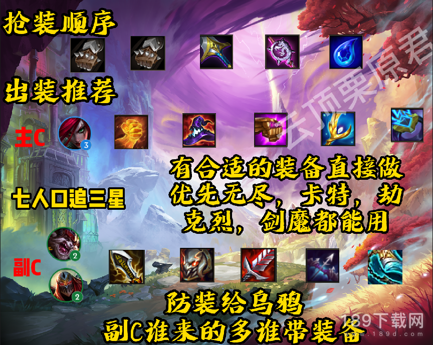 因为裁决这个羁绊自带12%吸血,所以卡特对吸血装备的要求并不高,正义不仅能提供高额的法强,还有一定的初始蓝量,帽子和法爆则可以将伤害最大化,副C劫和克烈,谁先三星谁带装备,都是互通的,防御装备全部给乌鸦。