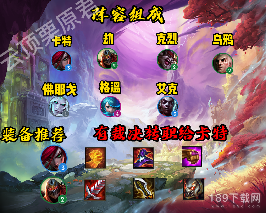 卡特,劫,克烈,乌鸦,佛耶戈,格温,艾克,组成的三诺克萨斯,四潜行者,二暗影岛,三裁决的阵容,其中卡特主C,劫,克烈,格温副C。