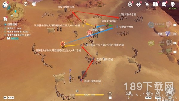 试炼任务:驱逐一定数量敌人;破坏一定数量木箱和木桶;投放苦离果不超过20次