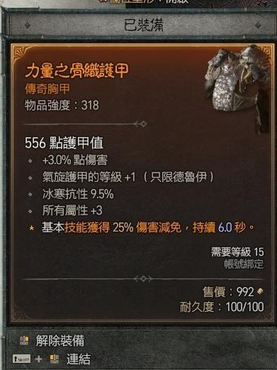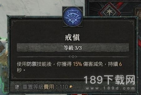 左边点出3/3 戒慎,狂吼同时,-15%伤害减免(元素、物理皆是。前置-先祖坚韧点出1就好 抗性用护身符、戒指撑高即可)