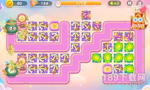 1、首先我们在中间位置放置两个船锚进行输出,优先攻击钱袋子获得金币。